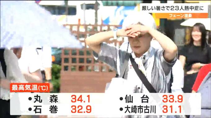 消防によりますと、午後5時半現在、県内では23人が熱中症の症状を訴え、気仙沼市では屋内にいた80代男性が重症で病院に運ばれたということです。
