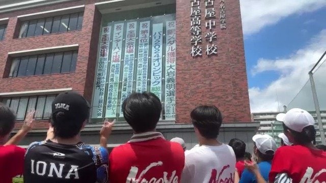 一方、チーム最年長の48歳、名古屋市出身の大岩選手の母校、名古屋市東区の名古屋高校でも、銅メダル獲得を祝う垂れ幕が掲げられ祝福ムードに包まれました。