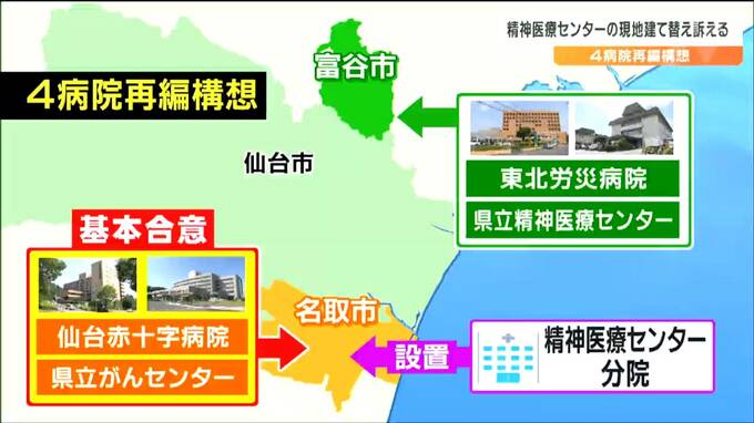 31日、精神疾患がある人とその支援者などでつくる2つの団体のメンバーは、仙台市役所で橋本啓一議長らと懇談しました。県が主導する4病院再編構想は、仙台赤十字病院と県立がんセンターを統合して名取市に、東北労災病院と県立精神医療センターを併設して富谷市に移転し、名取市には医療センターの分院を置くものです。このうち労災病院と精神医療センターについては基本合意に向けた県と仙台市の協議が続いています。