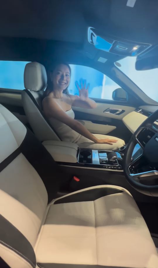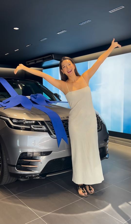 すみれさんは、リラックスした感じの白のサマードレスに黒のサンダルを合わせてディーラーに来店。「Our new family car has arrived!」(私たち家族の新しい車が到着したよ!)というテキストと共に、弾けるような笑顔で両腕を広げて迎えたのは、いぶし銀に輝く堂々たる車体の「レンジローバー・ヴェラール」。目の覚めるような青いリボンがかけられています。