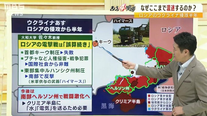 はい、この戦争はロシア側がオリンピックとパラリンピックの間で全て制圧しようと思っていたのが、ロシア軍の、プーチン政権の思惑だったんです。それが失敗に終わった。ウクライナは、キーウ近郊の橋を破壊して、ロシア軍の侵攻を阻みました。またロシアはハイブリッド戦といいまして、電脳(インターネット)空間でも様々なインフラを攻撃して地上軍の展開をしやすくしようと思ったんですけども、ウクライナ側がアメリカのIT企業だったり、そういったもので抑えた。それによって失敗したところから全てもう、プーチン大統領、ロシア側の誤算によって続いているというのがこの戦況だと思います。