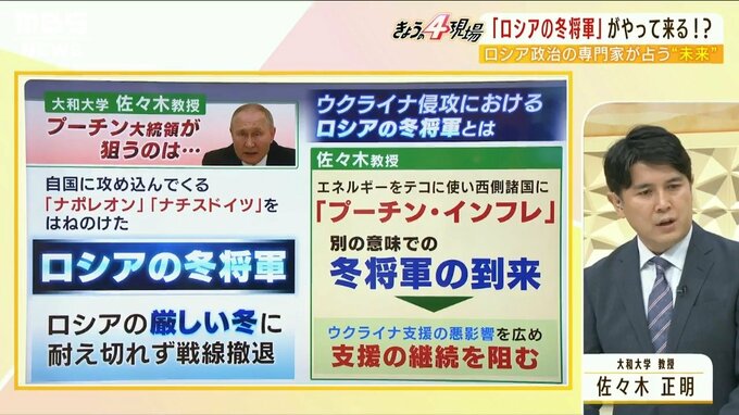 ―――佐々木先生によりますとプーチン大統領の思惑は、自国に攻め込んでくるナポレオン、ナチスドイツをはねのけた「ロシアの冬将軍」ということも考えているのではないかということです。ロシアの厳しい冬に耐え切れず、戦線を撤退したという過去にこういう歴史があったと。この冬というのが一つ大きなポイントになるんじゃないかということです。