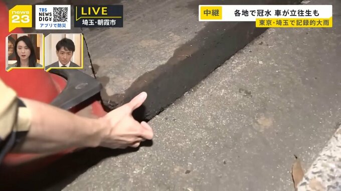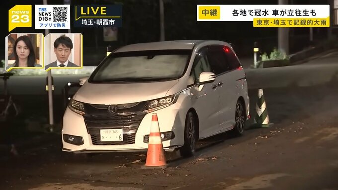 交差点の近くに白い車が停まっていますが、当時道路が冠水していて動けなくなったといいます。乗車していた人にけがはなく、「ちょうど膝の高さくらいまで水があったが、前の車が通過できたので続いて行ったところ、動けなくなった」と話していました。
