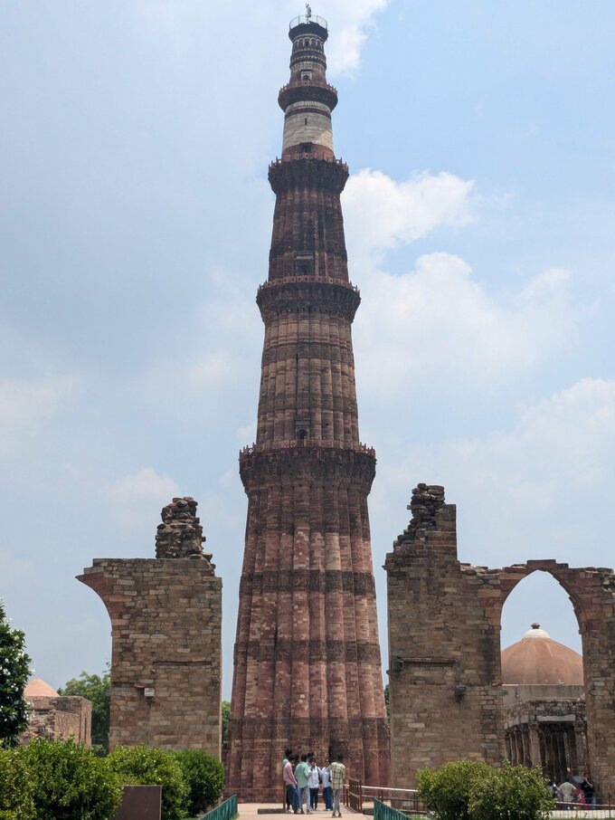 13世紀初めにインド初のイスラム王朝が作ったもので、イスラム教の礼拝堂・モスクとモスクには付きものの塔・ミナレットなどの遺跡です。ミナールとはヒンディー語で、ミナレットのこと。塔の高さは72メートルもあるのですが、当初はもっと高く100メートルもあったといわれます。