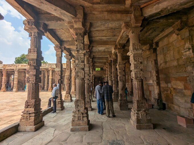 この赤い巨塔が、青い空を背景にそびえる姿は壮観でした。面白いのはモスクの部分で、元々はヒンドゥー教の寺院だった建物を改築して作ったため、ヒンドゥーの神々の彫像が柱などに残っています。