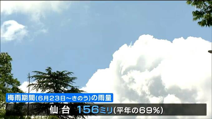 梅雨の間(6月23日~7月31日)に降った雨の量は仙台では156ミリと、平年の69%となりました。県内はこの先も平年より気温の高い状態がしばらく続く見込みで、熱中症にならないよう健康管理に注意が必要です。