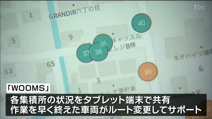 ごみ収集車には、システムを導入したタブレット端末が設置されています。これまで収集車は、それぞれ受け持つ集積所を回っていましたが、この「WOOMS」では、各集積所の状況をタブレット端末で共有することができ、作業を早く終えた車両がルートを変更してサポートし合うことができるということです。