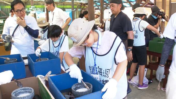 県内の小学5、6年生20人が参加し、うるま市の海中道路でつながる「平安座島」「浜比嘉島」「宮城島」「伊計島」の4つの島をめぐり、様々な体験をしました。