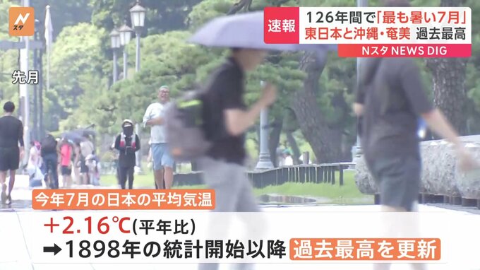 先月の平均気温が統計史上最も暑かった去年を上回り、記録の残る126年間で「最も暑い7月」だったことが分かりました。気象庁によりますと、先月の日本の平均気温は平年と比較して+2.16℃で、1898年に統計を取り始…