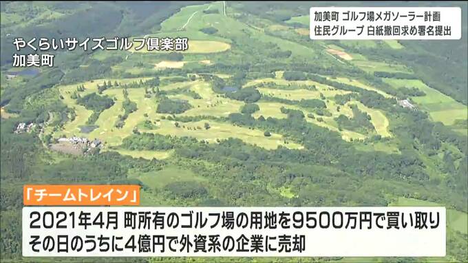 この問題は、加美町の「やくらいサイズゴルフ倶楽部」の運営会社「チームトレイン」が、2021年4月に町が所有していたゴルフ場の用地を9500万円で買い取り、その日のうちに4億円で外資系の企業に売却していたものです。