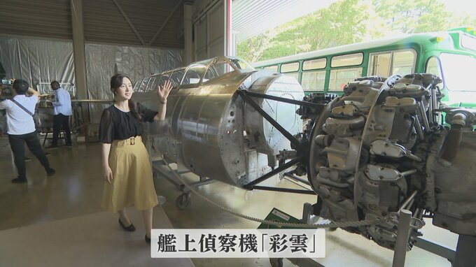 「偵察機・彩雲です。年々修復されていて今年は窓やエンジンがついて完成間近となって公開です」