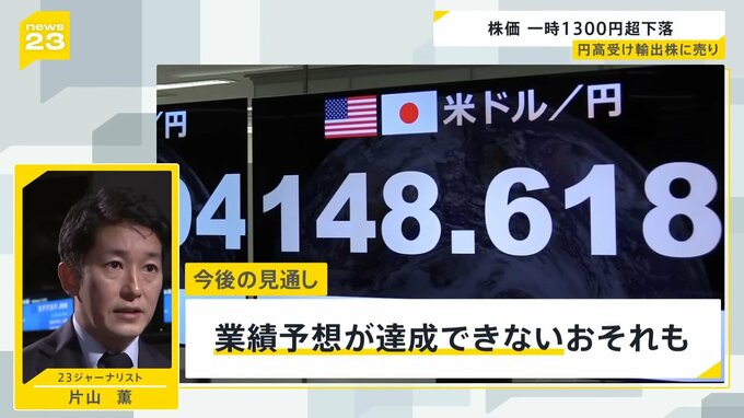 「1日の動向は、自動車・機械メーカーの株価下落。1ドル=155円台など円安が続くと想定していた企業は、業績予想が達成できないおそれも出てきている」