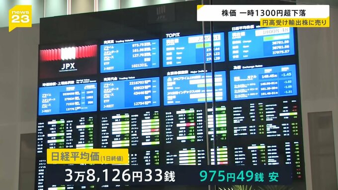 1日の日経平均株価の終値は、3万8126円33銭、前日より975円49銭の値下がりでした。