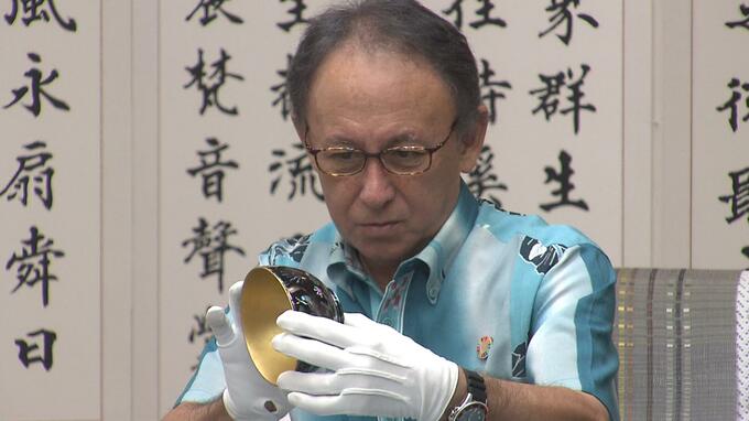 沖縄県内の漆芸作家たちが復刻に向けて制作していた琉球王朝時代の名品「黒漆雲龍螺鈿椀(くろうるしうんりゅうらでんわん)」。その完成を玉城知事に報告しました。
