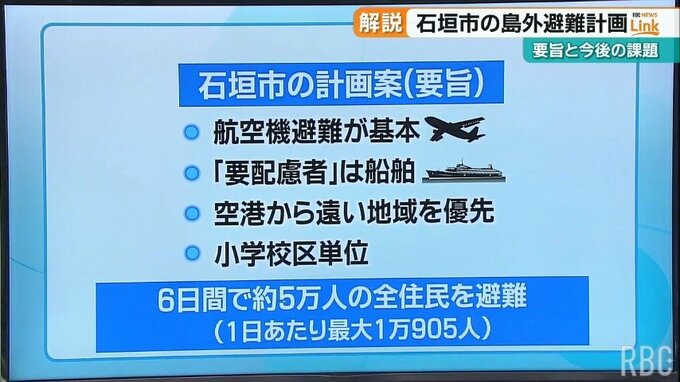 また、空港から遠い島の北部・西部・冨崎地区を優先に6日間で5万人の住民全員を避難させる案になっています。