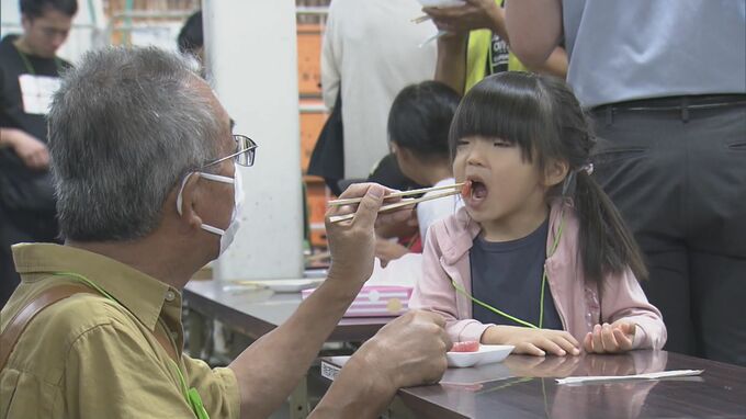 朝早くから始まる市場での仕事内容や地元産の食べ物の流通を学んでもらおうと12年前に始まったもので、親子22組が普段見ることができない野菜の競りやマグロさばきなどを見学。さばかれたマグロは参加者にも振る舞われました。この見学会は今月23日にも開かれます。