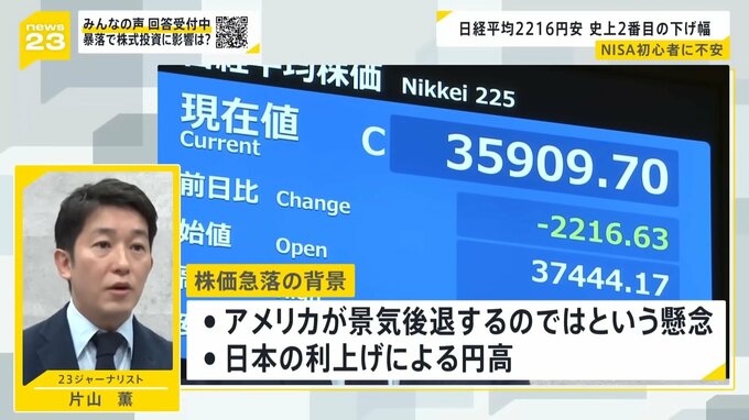 2日、日経平均株価が2200円以上下がる歴史的な暴落となりました。更に夜になって、円相場が1ドル=146円台をつけるなど市場が大きく動きました。NISAで投資をしている人からは不安の声も。また、アメリカでは景気を占う雇用統計が発表され、市場では今回の結果は景気後退局面に入ったことを示すシグナルだと受け止められています。