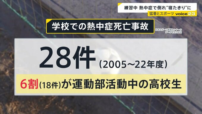 命の危険もある部活動中の熱中症。私たちJNNが「日本スポーツ振興センター」のデータを分析したところ、2005年度から2022年度の間に、学校現場での熱中症による死亡事故は合わせて28件。そのうち6割以上(18件)が「運動部活動中の高校生」だったことがわかりました。