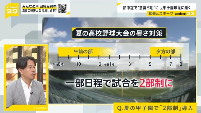 対策はあって当然ですよね。真夏の昼間に甲子園で開催するのは、もう難しいレベルだと思います。8月の夏の甲子園に対して思い入れがある中で、時間を変えるのは1つの手だと思います。
