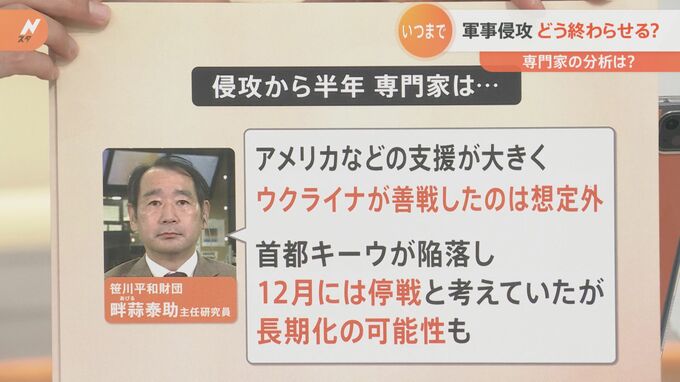 「アメリカなどの支援が大きく、ウクライナが善戦したのは想定外。首都キーウが陥落し、12月には停戦と考えていたが、長期化の可能性も。」
