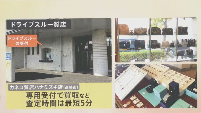 続いてドライブスルーの質屋さん「カネコ質店ハナミズキ店(高崎市)」です。ドライブスルーの場合は専用受付で買取を行っています。査定時間は最短5分ということです。質屋さんですと少し店内が狭くて行きづらい・・・という方もいるので、ドライブスルーは人気なんだそうです。