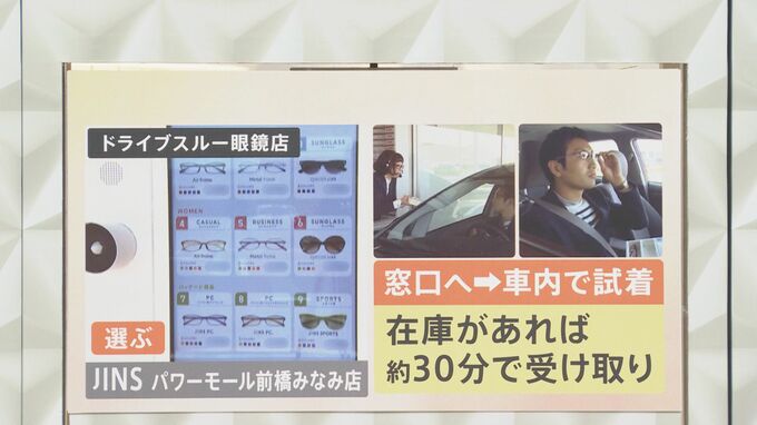 まず最初に紹介するのはドライブスルーの眼鏡店「JINS パワーモール前橋みなみ店」。どういう仕組みかというと、ファストフード店のドライブスルーには注文受付のディスプレイがあると思いますが、(ドライブスルーの眼鏡店では、)そこに眼鏡が表示されているんです。
