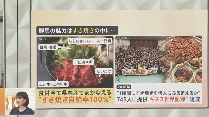 群馬はドライブスルーだけではありません、「キャベツ(夏秋)」や「こんにゃくいも」の収穫量が全国1位です。農畜産物は多種多彩で、「すき焼き」の食材を群馬県産のものだけでも作れたりするんです。白菜、春菊、しらたき(こんにゃくいも)、豆腐、ネギ、しいたけ、牛肉など、すき焼きの食材すべてを群馬のものだけでまかなえるので、“すき焼き自給率100%”なんて言われています。2018年には“1時間にすき焼きを何人にふるまえるか”でギネス世界記録を達成してるんです。
