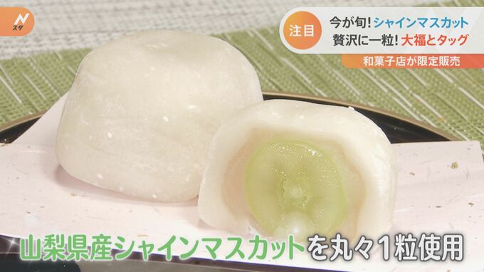 大福には、山梨県産のシャインマスカットを丸々1粒使用。