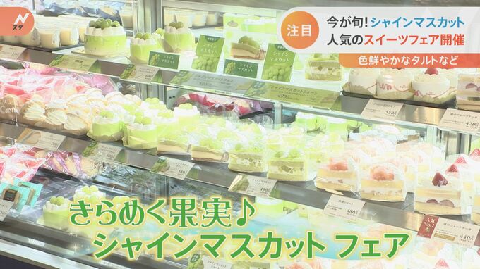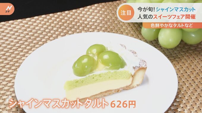 中でも、イチオシというのが、今回からフェアに仲間入りした「シャインマスカットタルト 」(626円)。香ばしいタルトにマスカット風味のカスタードを重ね…特製のジュレをかけたシャインマスカットが乗った一品です。