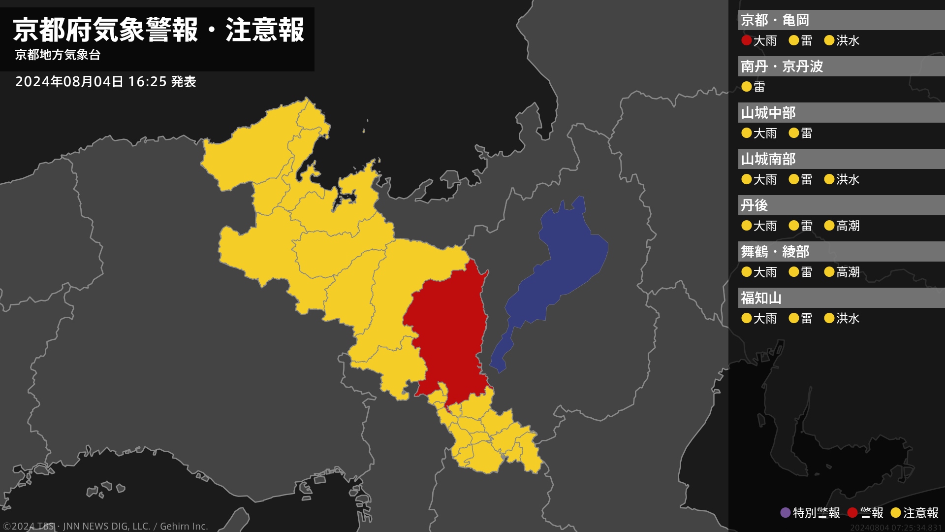 気象台は、午後4時25分に、大雨警報(浸水害)を京都市に発表しました。