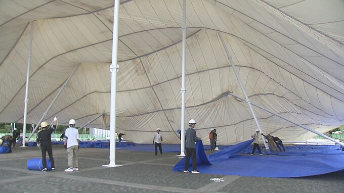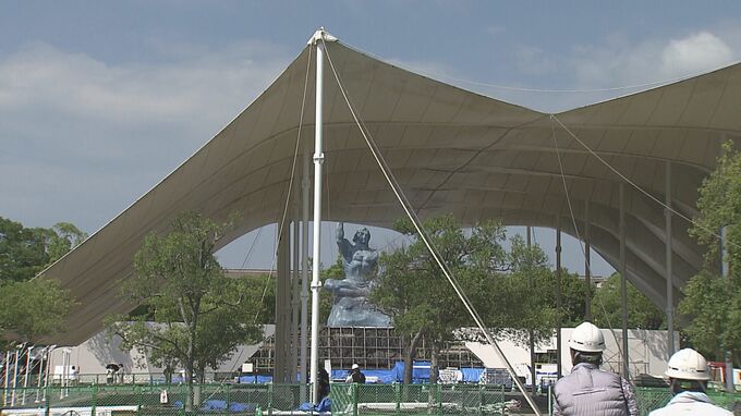 長崎市では最高気温がことし最も高い36・2度まで上がるなか、平和公園では、午後、作業員がクレーン2台を使って縦、横およそ40メートルの大型のテントを立ち上げました。