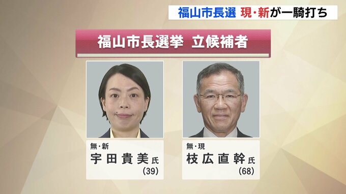任期満了に伴う福山市長選挙が告示され、現職、新人の2人が立候補しました。福山市長選挙に立候補したのは、届け出順に◆無所属、新人で会社員の宇田貴美氏(39)◆無所属で現職の枝広直幹氏(68)の2人です。選挙…