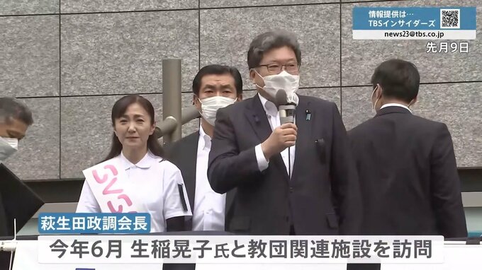 参院選を控えた2022年6月、生稲晃子氏と共に教団関連施設を訪れた萩生田氏。