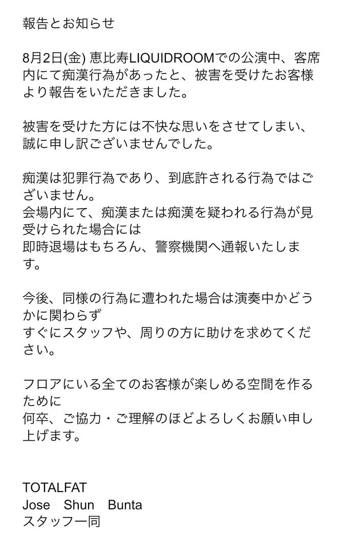 公式サイトでは、「報告とお知らせ」と、題し「8月2日(金) 恵比寿LIQUIDROOMでの公演中、客席内にて痴漢行為があったと、被害を受けたお客様より報告をいただきました」と公表。「被害を受けた方には不快な思いをさせてしまい、誠に申し訳ございませんでした」と、謝罪しました。