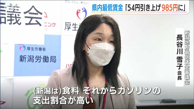 【新潟地方最低賃金審議会 長谷川雪子 会長】「(新潟は)食料・ガソリンの支出割合が高い。どちらも物価上昇率が高い品目です。その結果、全国より数値的に上回る結果が出て、労働者の生活を守るためにもう少し賃金は上乗せした方がいいだろうということで」