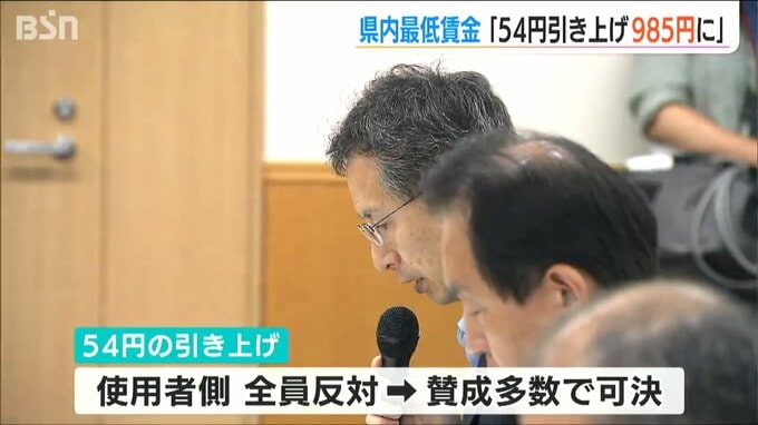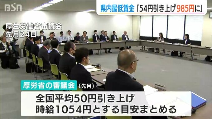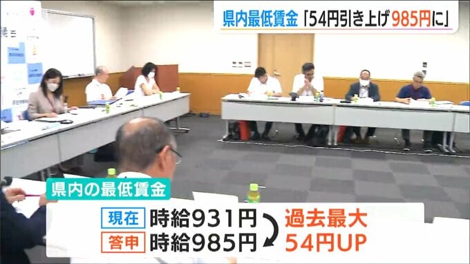 現在、県内の最低賃金は時給931円となっていますが54円引き上げ、985円が妥当としました。過去最大の上げ幅です。