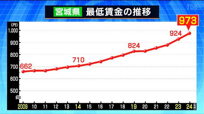 宮城地方最低賃金審議会は、県内の最低賃金を現行の923円から50円引き上げて973円とするよう、5日、宮城労働局に答申しました。
