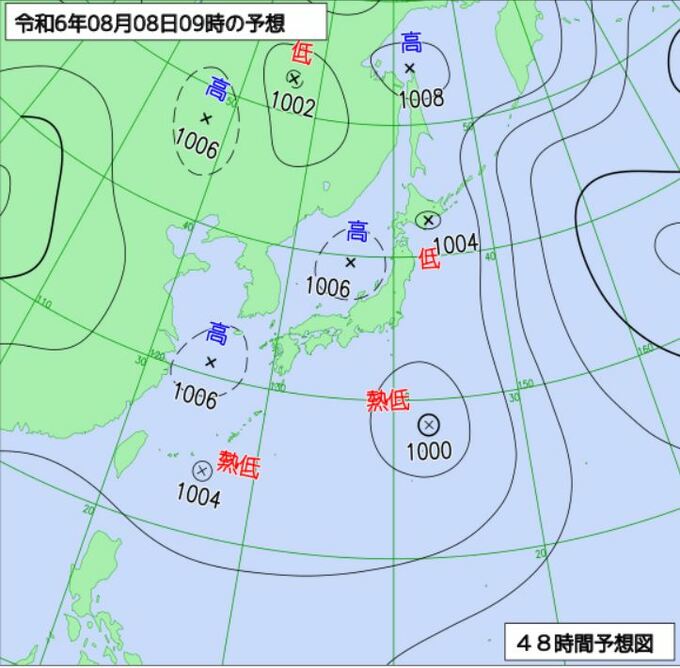 日本の南に「熱帯低気圧」2つ発生 日本への影響は? 台風へと変わる可能性は? 進路によっては本州へと近づき、関東に影響が出る可能性も 山陰放送 2024年8月6日(火) 22:13 国内 続いて、気象庁の天気図です。 気象庁HPより 24時間予想図、48時間予想図です。 気象庁HPより 気象庁HPより