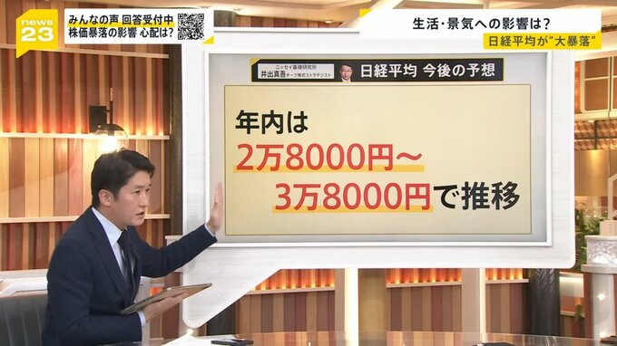 井出真吾チーフ株式ストラテジストは、日経平均の今後の予想は「年内は2万8000円台まで落ちる可能性もある」と見ています。ただ一方で、「3万8000ぐらいまで上がることもある」と、かなり乱高下してどちらに振れるのかわからない。振れ幅も非常に大きいので、それだけ不安定だ、というふうに見ています。