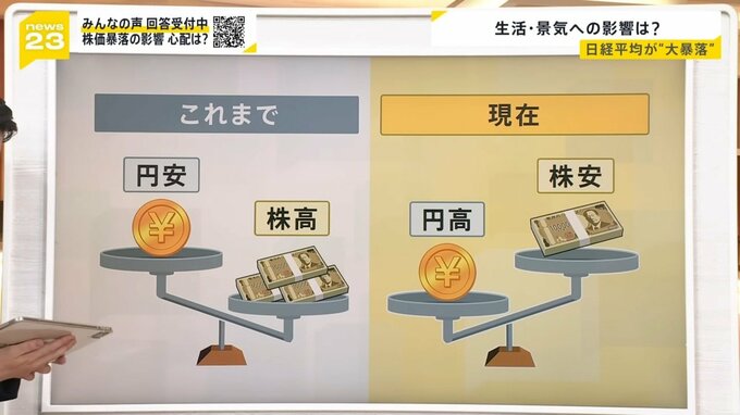 これまで株というのは「円安だと株高」という構図でしたが、潮目が変わり「円高になると、株安」という流れになっています。この株安の動きを見た投資家の売りが、さらに売りを呼んだということで、歴史的な大幅な株の暴落になったのではないか、と説明しています。