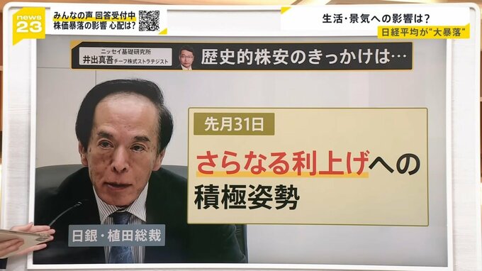 ニッセイ基礎研究所の井出真吾チーフ株式ストラテジストにお話をお聞きしました。歴史的株安の要因の一つは、7月31日の日銀・植田総裁の発言にあったとみています。植田総裁は「さらなる利上げ」を示唆したので、それにより円高になりました。