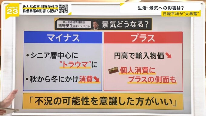ただ、熊野主席エコノミストは「不況の可能性を意識した方がいい」と話しています。これまでも株価が急落し、そこから不況になるケースもありました。今すぐそうなるとは言えませんが、やはりそういう可能性は意識する局面だと話しています。
