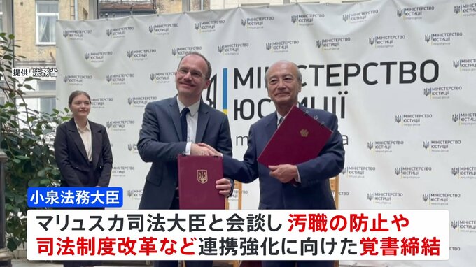小泉法務大臣が日本の法務大臣としてウクライナを初めて訪問し、汚職対策での連携強化に向けた覚書をウクライナの司法大臣と締結しました。5日の早朝にウクライナに入った小泉法務大臣は、多くの人が犠牲となった…