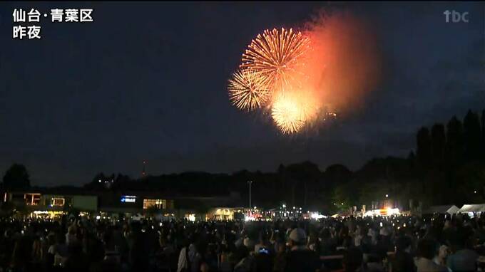 青葉区の西公園周辺で行われた仙台七夕花火祭。55回目となる今年は例年よりも長い75分間で1万6000発の花火が打ち上げられました。観覧席では、訪れた人たちが夜空を彩る鮮やかな大輪の花に見入っていました。
