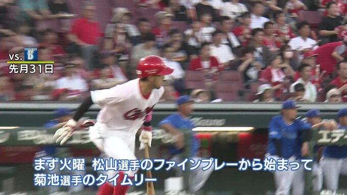 「まず7月30日(火)、松山竜平 選手のファインプレーから始まって、31日(水)の 菊池涼介 選手のタイムリー。矢野雅哉 選手にたくさんのファインプレーが出て、攻守ともにすばらしい1週間だったと思います」