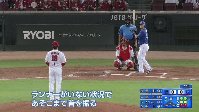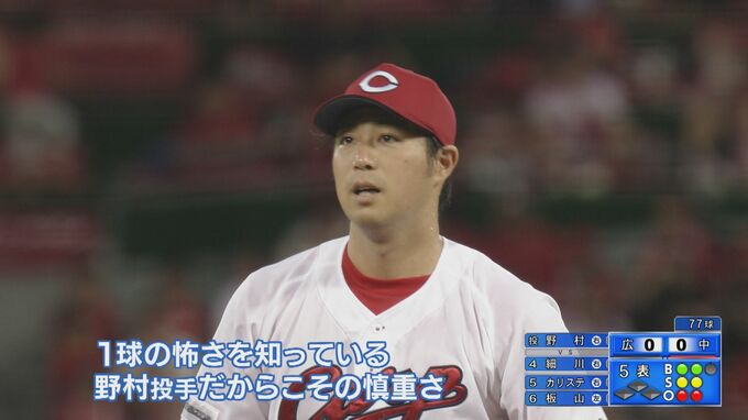 「8月2日(金)の 野村祐輔 投手のピッチングです。もちろん、5回無失点。初登板ですばらしいピッチングだったんですけれども、その中でもちょっと印象に残ったプレーが…。5回、2アウト、バッターは中日の 細川成也 選手。