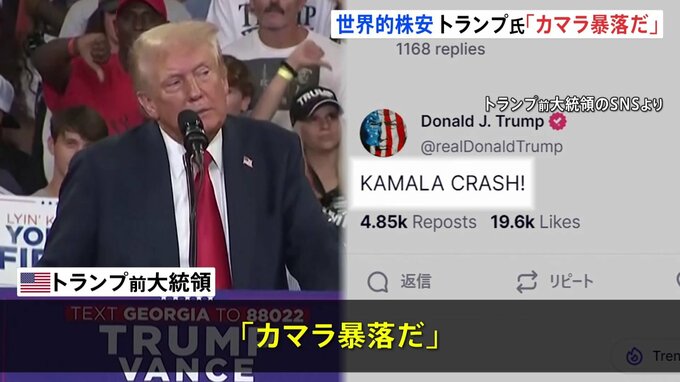 世界的な株安がアメリカの株式市場も直撃したことを受けて、トランプ前大統領はハリス副大統領の名を使い、「カマラ暴落だ」と持論を展開しました。5日のニューヨーク株式市場は世界的な株安の流れを受けて、先週…