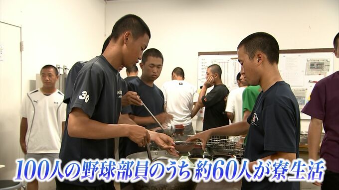 野球部は約100人の大所帯。その半数以上が県外出身者で、一つ屋根の下で生活を共にしています。出身地は大阪、兵庫、沖縄などさまざま。甲子園を目指し、親元を離れて岡山の地で暮らしています。