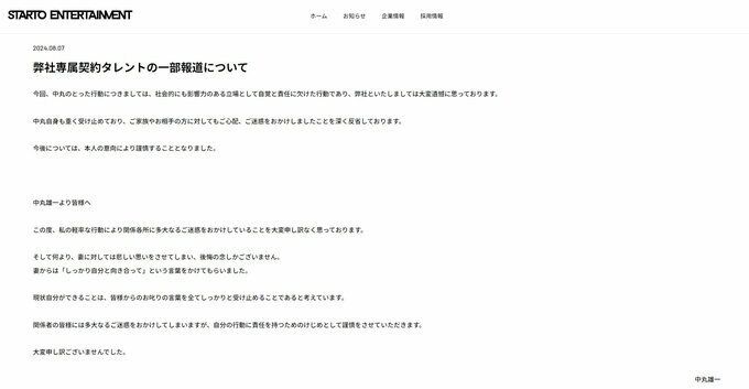 公式サイトでは「今回、中丸のとった行動につきましては、社会的にも影響力のある立場として自覚と責任に欠けた行動であり、弊社といたしましては大変遺憾に思っております。」と、投稿。