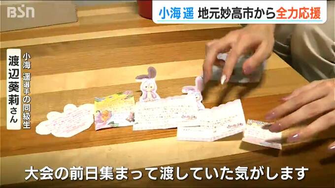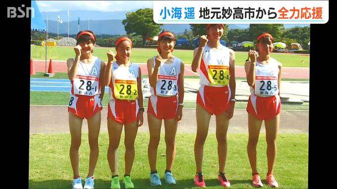 パリ五輪で陸上・女子1万mに出場する小海遥選手の母・香里さんに花束を手渡したのは、遥選手と中学校時代の同級生だった渡辺葵莉さん(妙高市職員)。